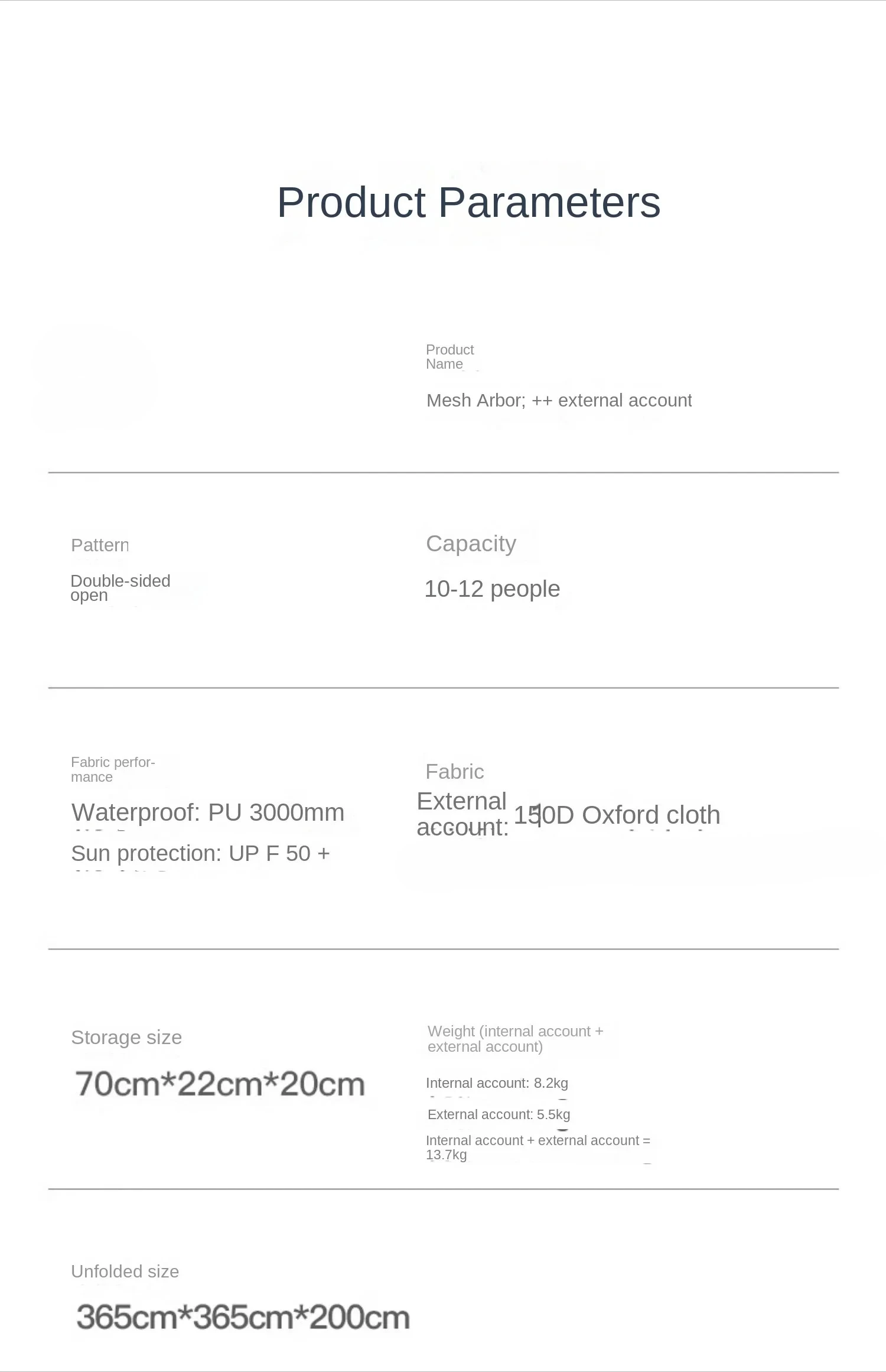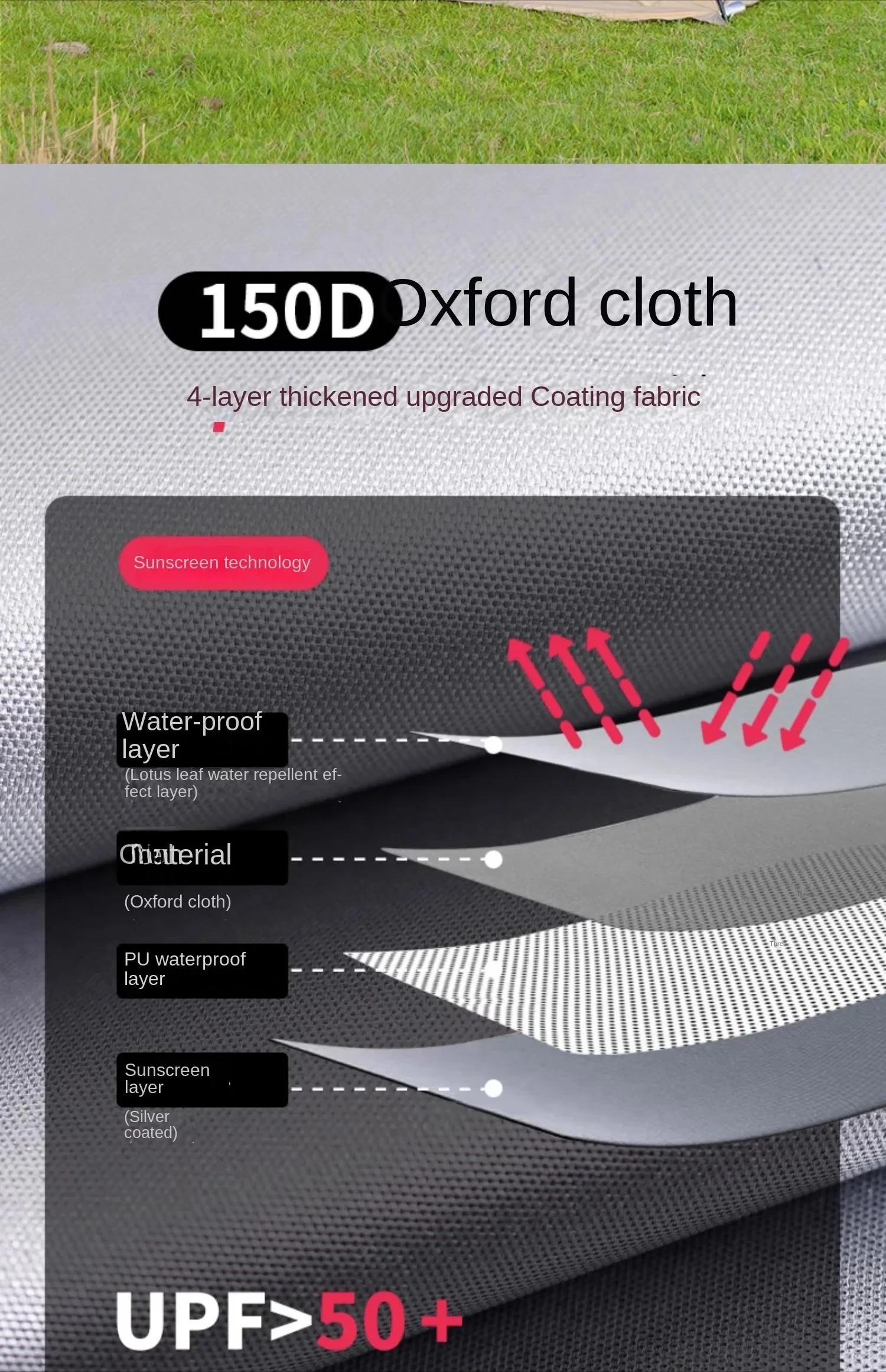 Material: 150D silver coated Oxford cloth, B4 high-density mesh, fiber rod with good toughness for the roof pole, and painted steel pipe for the column pole
