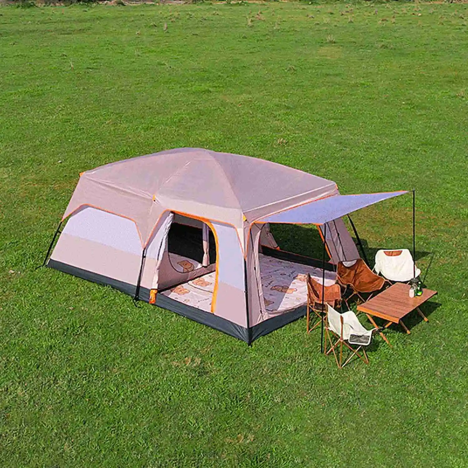 Luxury outdoor tent, two bedroom and one living room design, thickened rainproof double layer, providing a comfortable outdoor living experience.Color: Beige/Orange/Blue/Coffee/Dark Green(Optional)