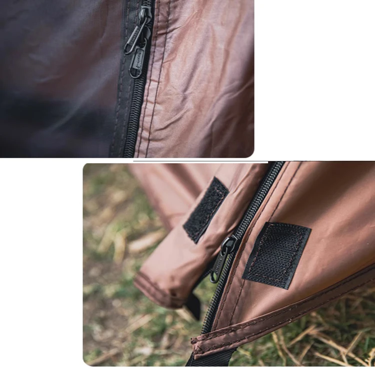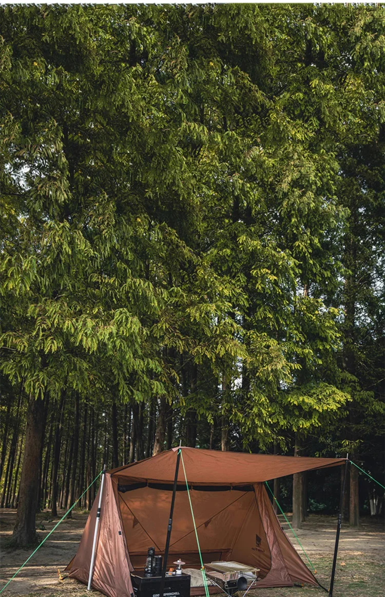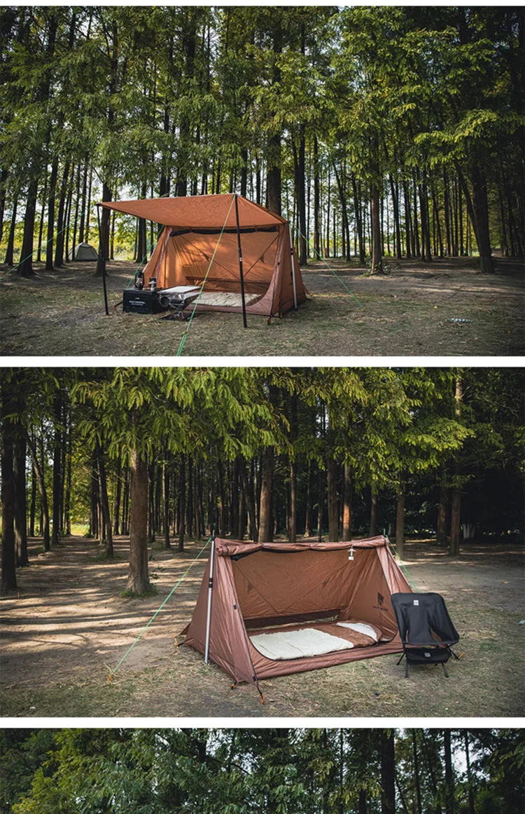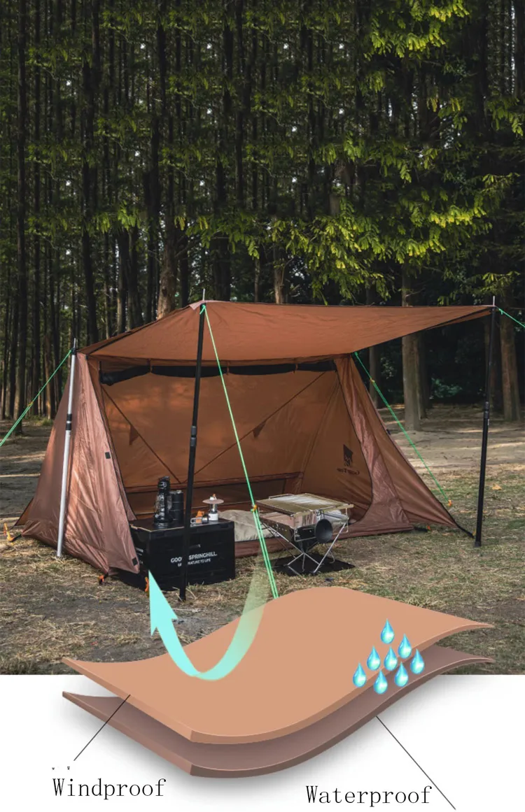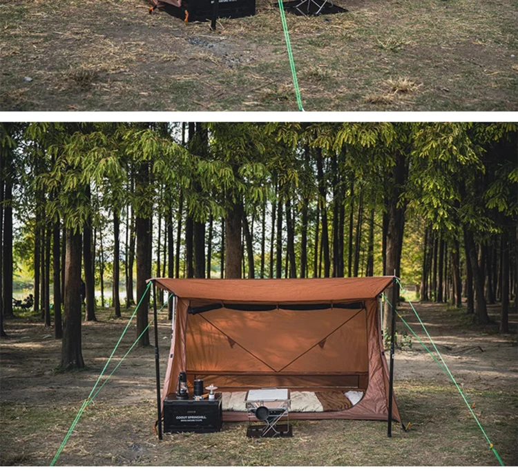 【Versatile Jungle Shelter】: You can raise the canopy to make a porch area for your wood stove, or zip it up during heavy rain or snow, then it becomes a regular frame tent like a fort ; Very easy to set up using the tent pegs and guy wires provided, you can support it with sticks or canes, or just set it up between trees without poles; coffee color options to better blend in with the wild nature.