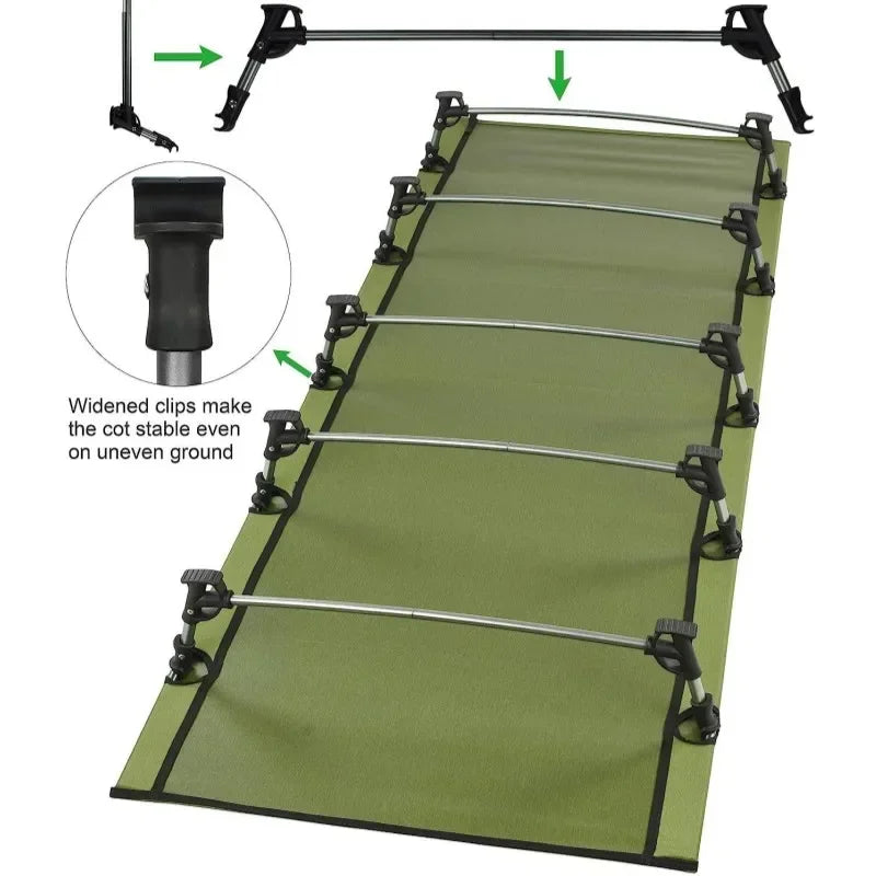 Comfort: Cot size is optimal for most people, your arms can stay in the bed without crowded feeling. 5 heavy duty rods strongly support the cot make cot surface flat without sag. 10 anti-skid feet make the bed stable without wobbling. Off ground design keeps you away from hard and wet ground.