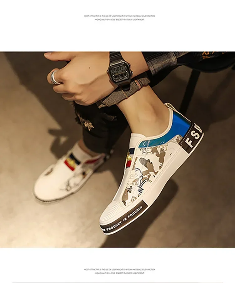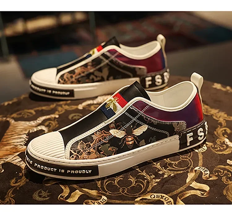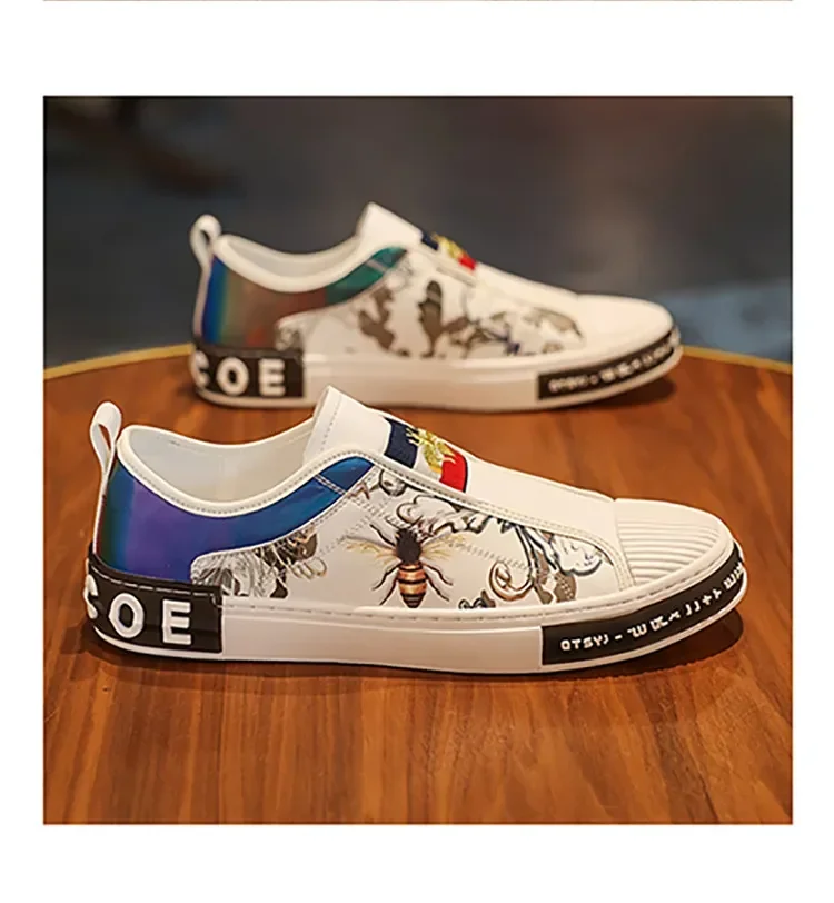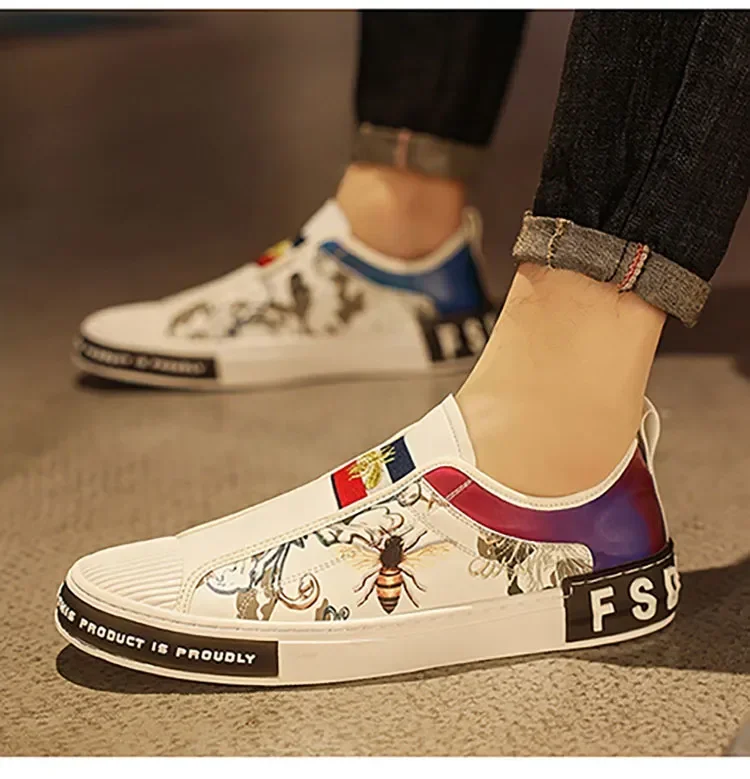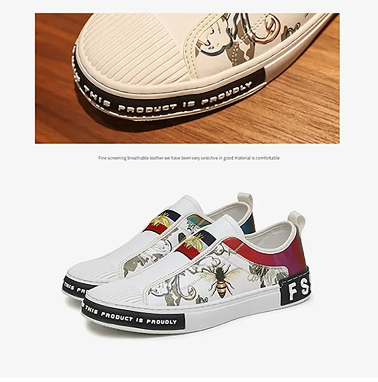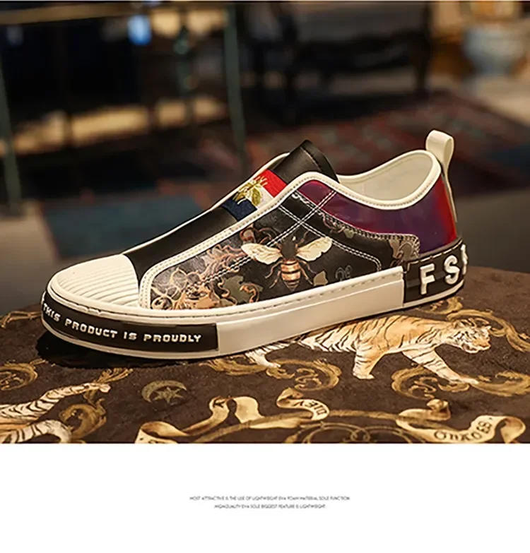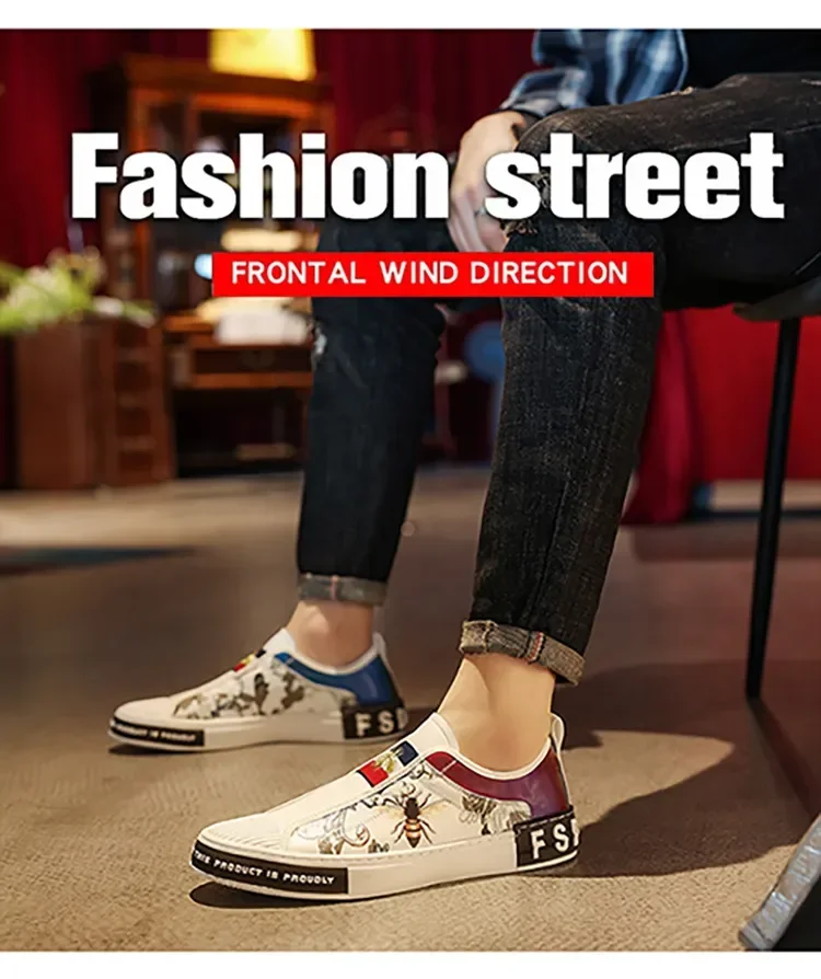 Men’s Leather Slip-On Sneakers – Trendy Casual Loafers with Street Style Print
